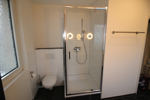Das großzügige Duschbad mit Fenster ist mit einer großen Dusche, Waschbecken, WC und Fön ausgestattet.