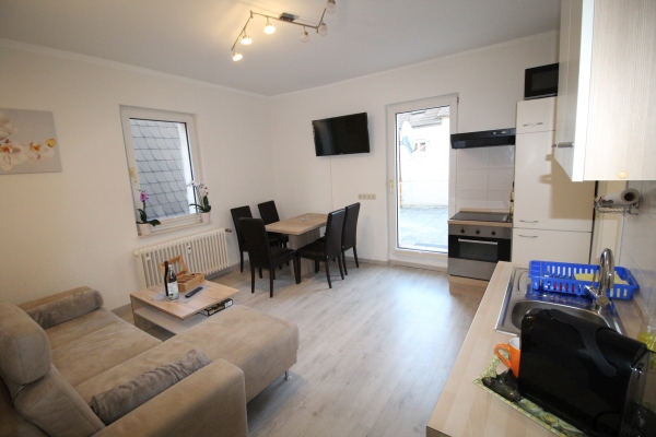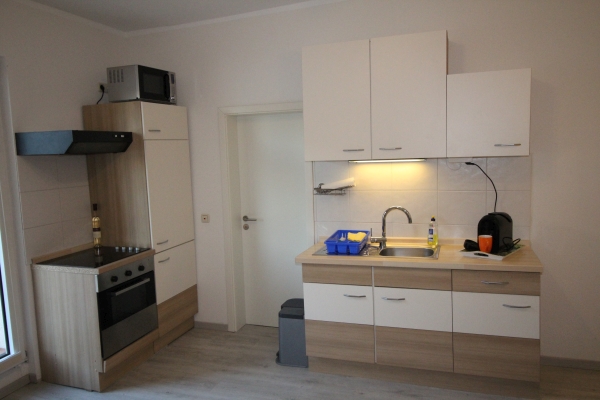 Der Wohnbereich ist mit einer komfortablen Couch, Couchtisch sowie Flachbild-TV mit SAT-Empfang sowie Esstisch eingerichtet. Die Küche verfügt vom Wasserkocher, über die Mikrowelle, Herd mit Backofen bis hin zur Tchibo-Kapsel-Kaffeemaschine, Filterkaffeemaschine, Toaster, Gläser, Geschirr, Besteck, Töpfe, Pfanne, etc.