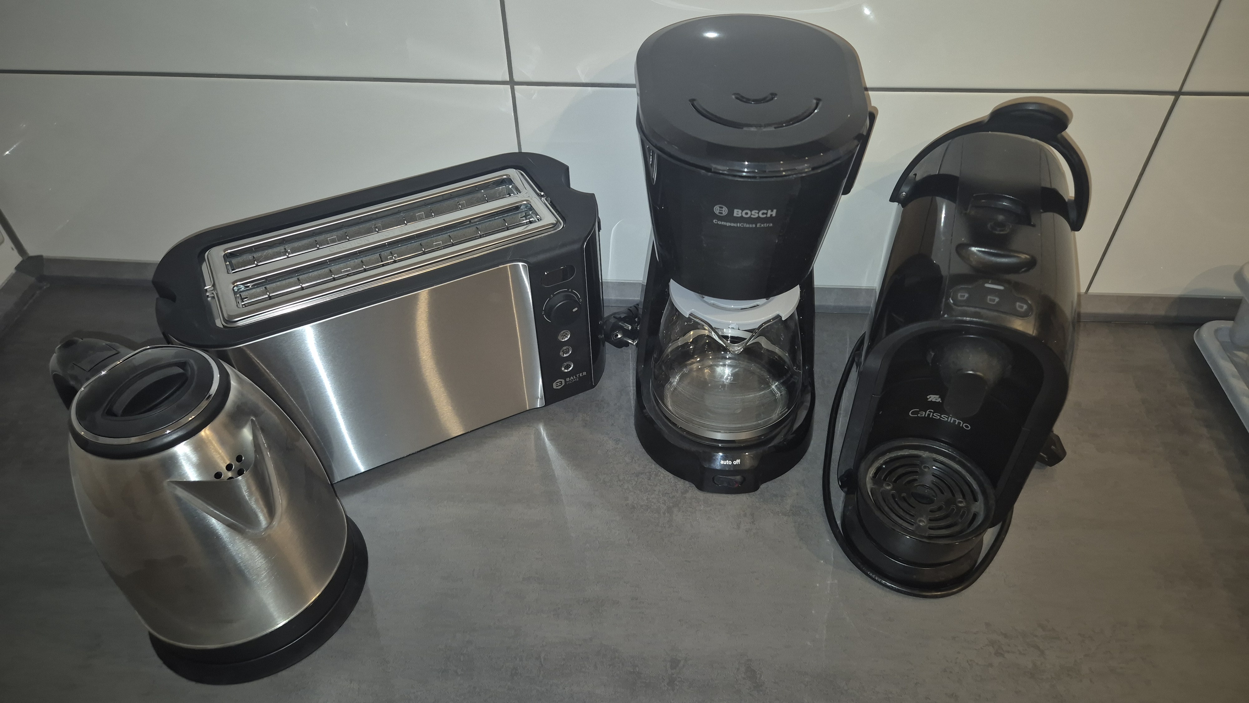 Die Küche verfügt vom Wasserkocher, Kontaktgrill, Herd mit Backofen bis hin zur Tchibo-Kapsel-Kaffee-Maschine, Filterkaffeemaschine, Toaster, Gläser, Geschirr, Besteck, Töpfe, Pfanne, etc.