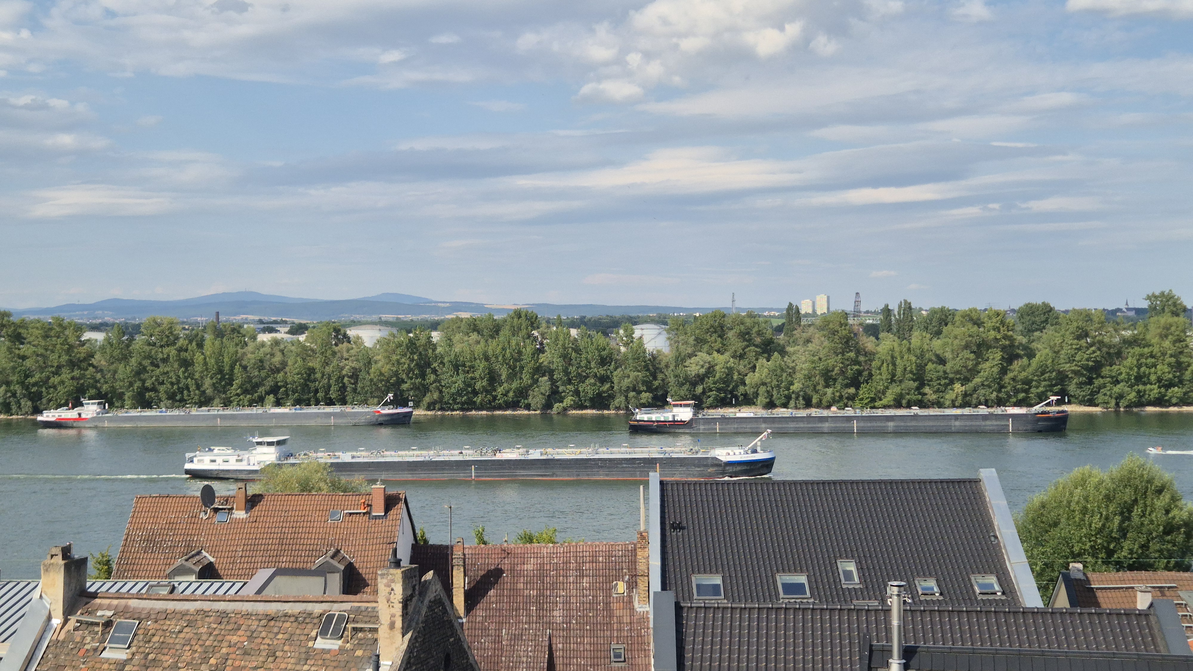 Vom Wohnzimmer gelangen Sie auf die schöne gemütliche Terrasse mit Blick in die Ferne und auf den Rhein.