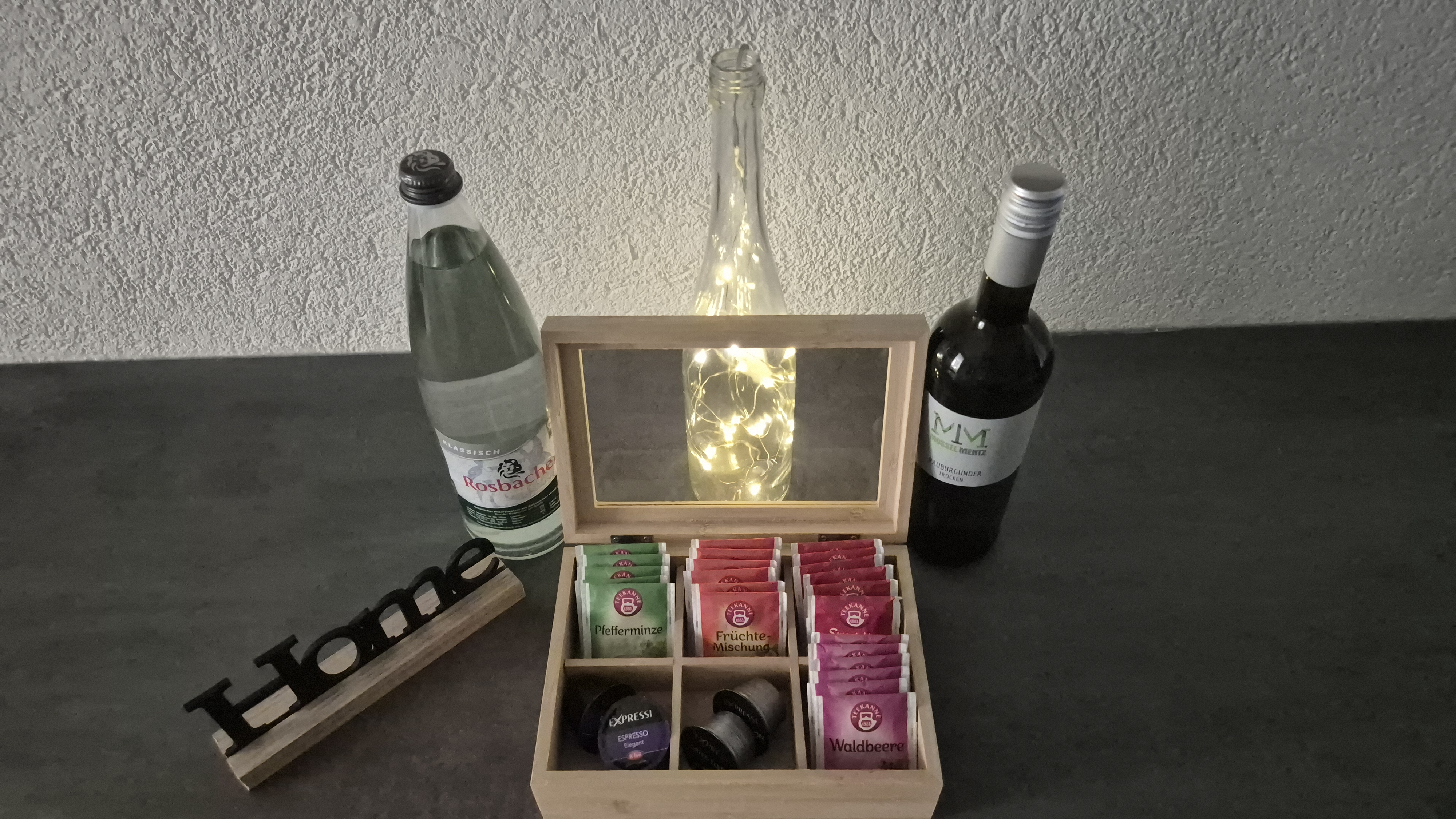 Zur Begrüßung erhalten unsere Gäste eine kleine Erstausstattung, u.a. Kaffeekapseln, verschiedene Teebeutel, 1 Flasche Wein aus der Region sowie 1Flasche Mineralwasser.